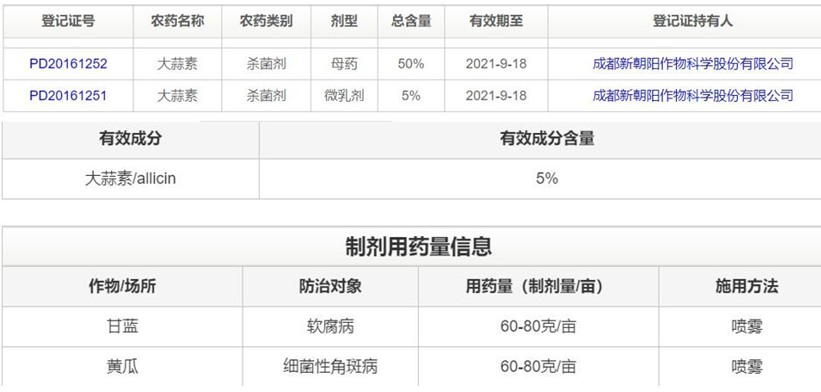 根據世界農化網報道,新朝陽推出了植物源殺菌產品5%大蒜素微乳劑,目前已獲得中國農藥登記并于2016年9月18日上市。能夠很好的預防性甘藍軟腐病,黃瓜細菌性角斑病等細菌性病害,同時能夠預防辣椒枯萎病,川芎根腐病等真菌性病害,實現良好的抗病管理。